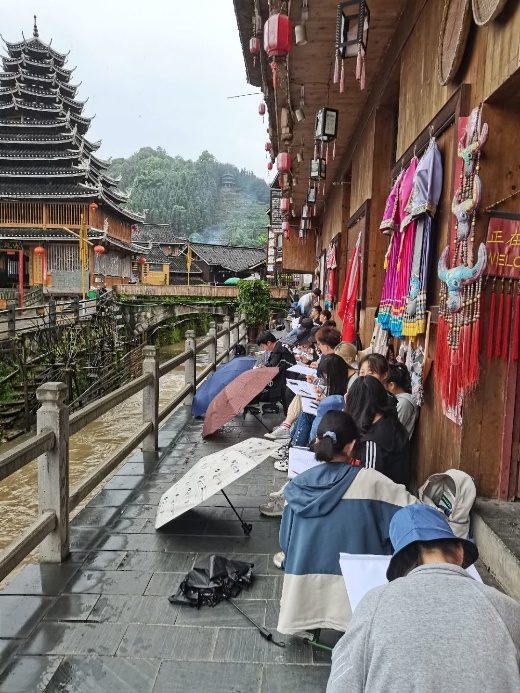 队伍首先前往皇都侗文化村,到达目的地后,在老师的指导和要求下,大家以鼓楼写生开始,随后又分组在文化村的各个地点进行写生绘画。