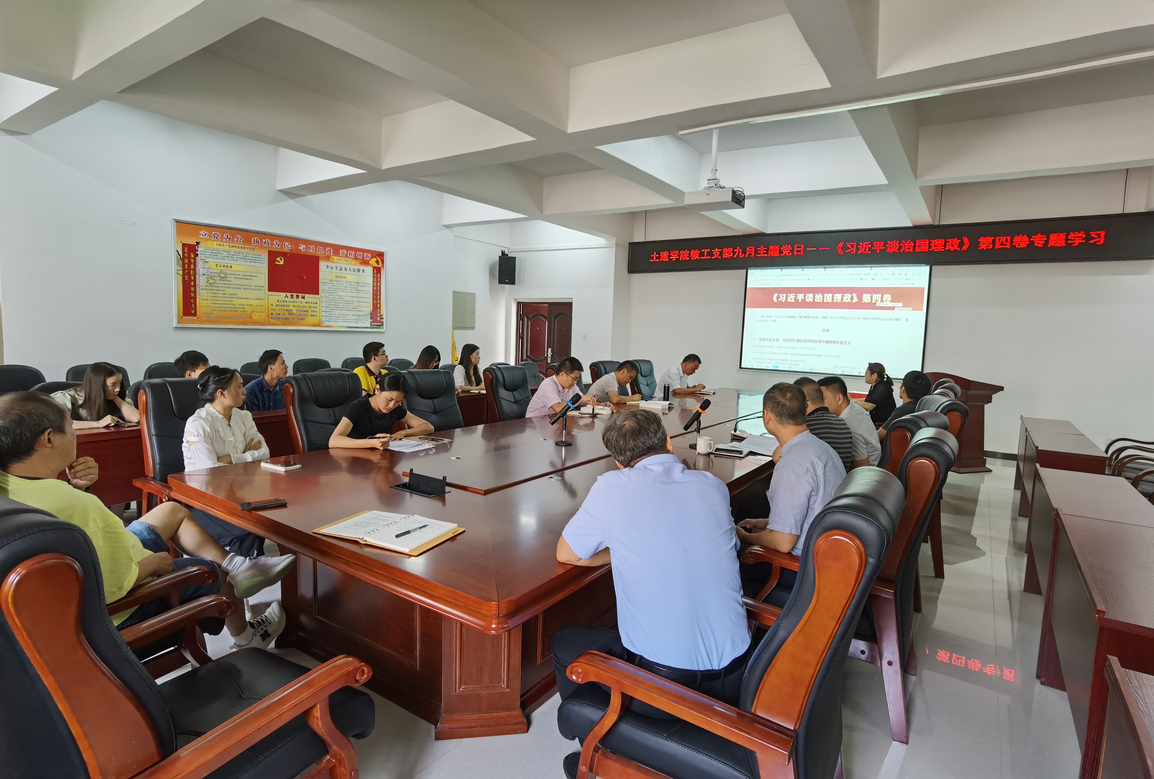 2022年9月16日,土木工程与建筑学院教工党支部九月主题党日活动如期举行。活动以观看视频、学习原著和研讨的形式开展,重点学习了《习近平谈治国理政》第四卷,简要学习了《让群众过上好日子--习近平正定足迹》等五部图书的部分内容。活动由教工党支部书记彭艳同志主持,公司党委书记向成绪、经理吴吉林等全体教工党员参加了活动。