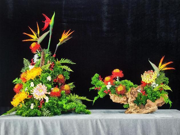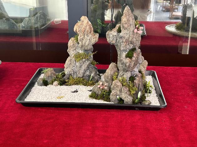 插花作品通过巧妙的构思和精湛的技艺,将花材与器皿完美结合,呈现出了一幅幅古朴典雅、韵味十足的花艺作品,同时大胆创新,运用新材料、新技法,创作出了充满现代感和时尚气息的花艺佳作;假山盆景利用泡沫、铁丝等材料进行生动刻画真实山体的形状及颜色,灵动自然。这些作品让人欣赏到了插花艺术和假山盆景的魅力所在,走进展出大厅,仿佛置身于一个个精心雕琢的小场景之中,各式各样的插花作品错落有致地摆放在大厅内,每一件作品都别具一格,让人流连忘返。有的插花作品以清新淡雅为主题,花朵与绿叶相互映衬,一抹春色;有的假山作品则以雄浑壮观为特色,假山巍峨耸立,绿意点缀其间。
